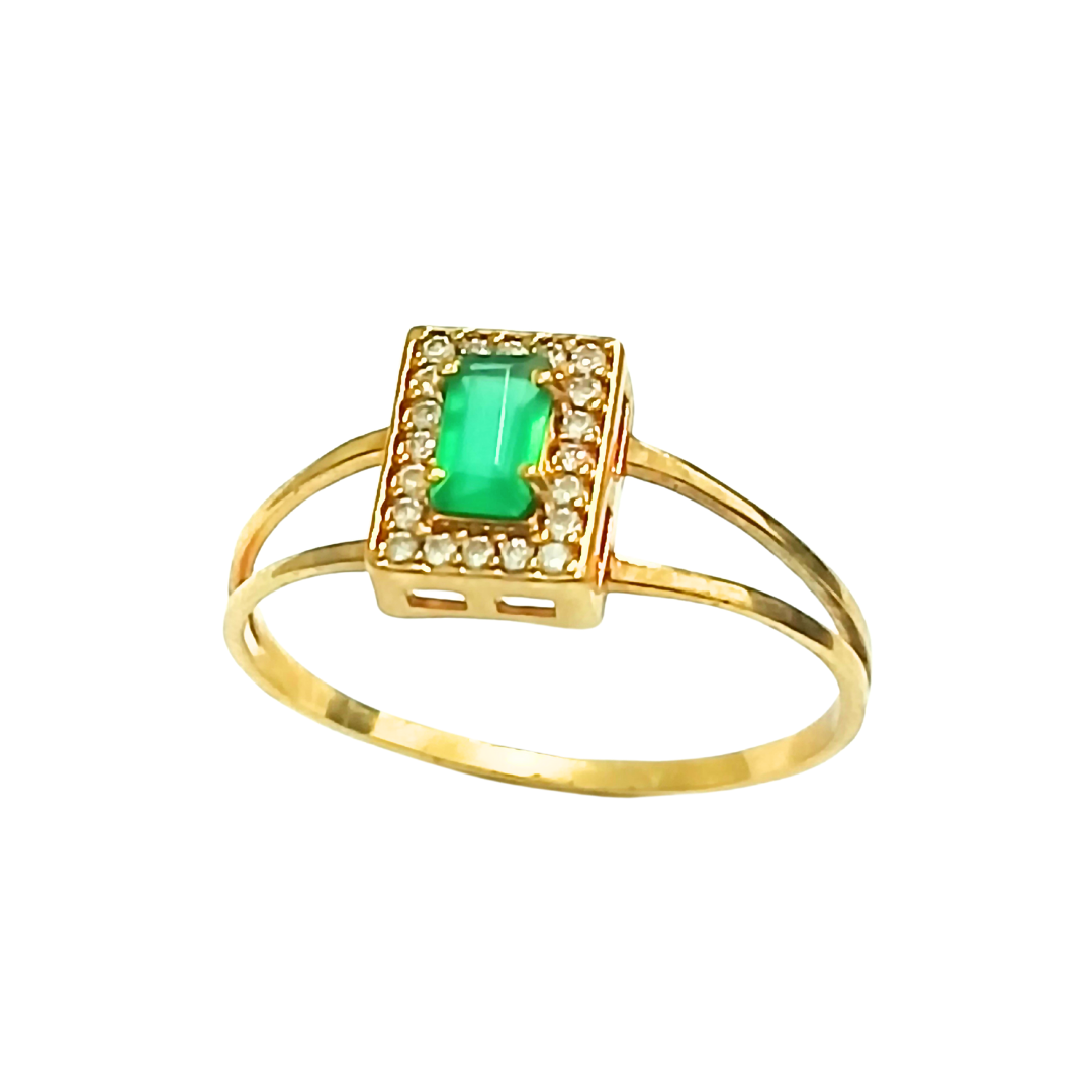 Anel Formatura em ouro 18K, com 1 pedra de centro baguete natural ou sintética de 4 x 5 mm e 20 pedras de 0,5 Pts
