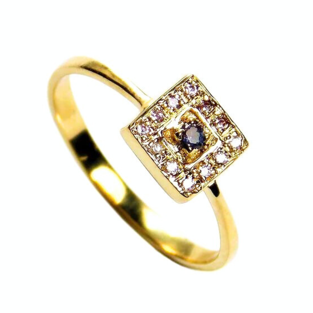Anel Labirinto em ouro 18K, com 1 pedra natural ou sintética de 1,5 mm e 12 pedras de 0,5 Pts