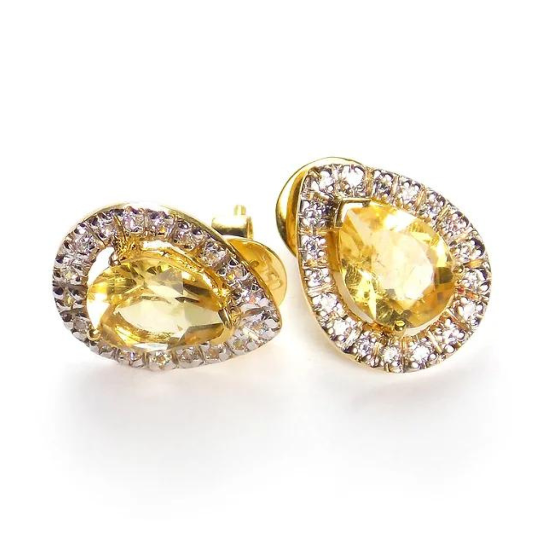 Brinco Gota de Ouro em ouro 18K, com 36 pedras naturais ou sintéticas de 0,5 Pts e 1 pedra gota natural ou sintética de 6 x 9 mm