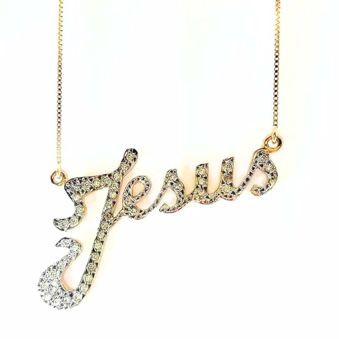 Colar Jesus em ouro 18K, com 44 pedras naturais ou sintéticas de 0.5 Pts